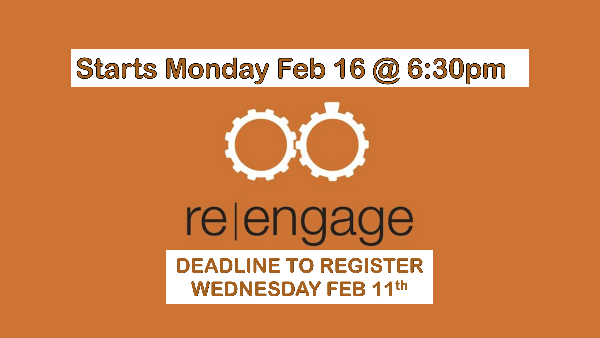 Are you ready to take your marriage to another level? Whether you have been married for 5 days or 50 years, Re-Engage is for you! Start date is Monday Feb 16th. Cost is $20 per couple. Childcare is provided for ages Birth-5th upon registration.
